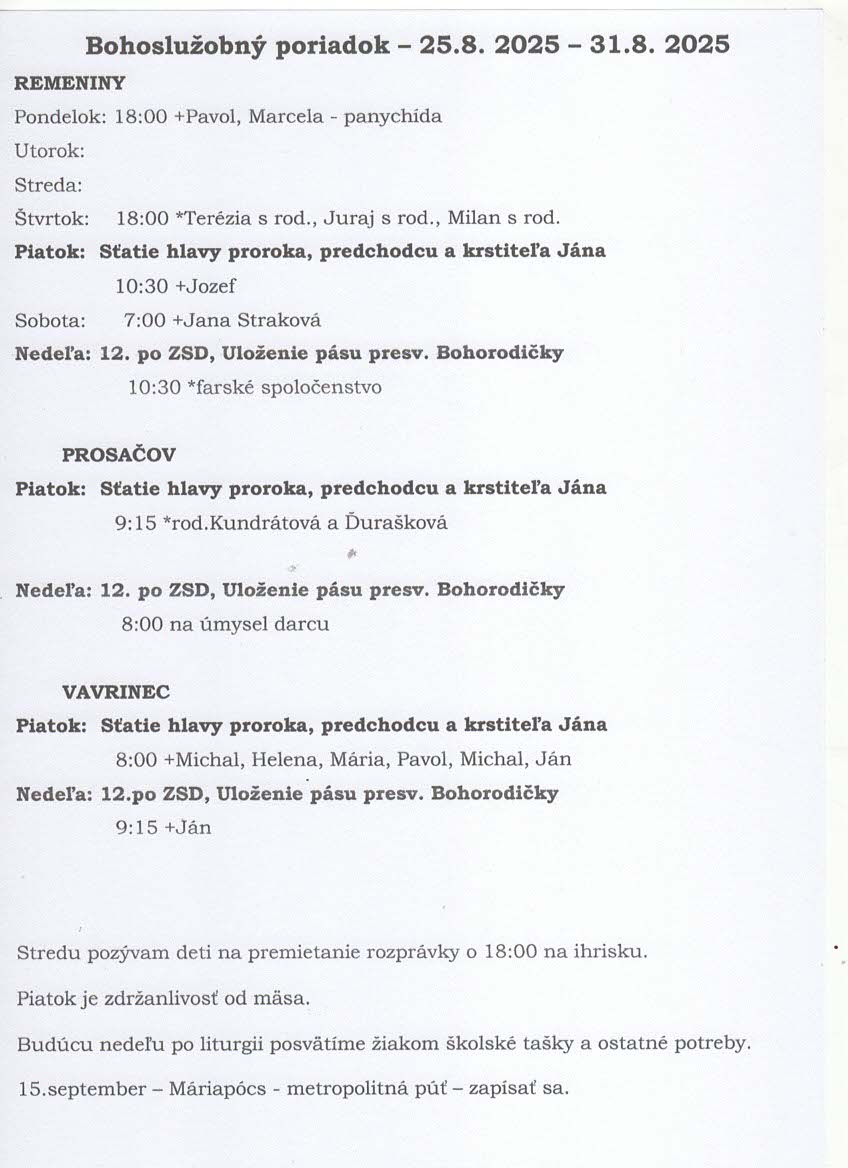 Liturgický program 25.8. - 31.8. 2025